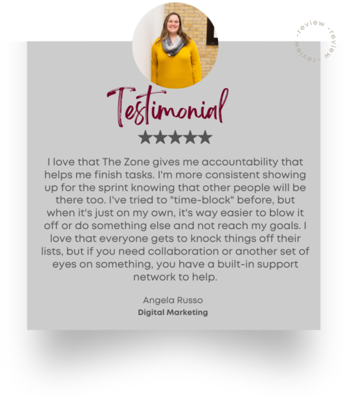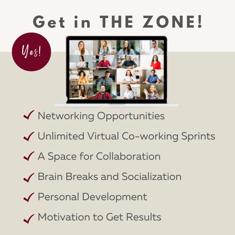 Members are welcome to join any or all of our hosted coworking sprints each month and pop into The Zone anytime 24/7/365 to get work done. Show up ready to accomplish whatever you need to tackle next and know that you will be held accountable to get things done!